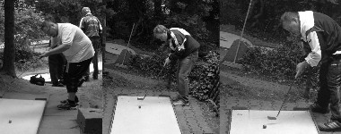 | Die Tabellensituation nach dem vierten MT versprach einen spannenden Spieltag in Dortmund Syburg. In der ersten Runde zeigten Biebertal mit 147 und Lüdenscheid mit 148 gute Anfangsrunden und distanzierten die anderen Teams mehr oder weniger deutlich: Syburg 160, AS Witten 165, Herdecke 168, Annen 170. Dabei wurden mehr rote und schwarze Runden gespielt als sonst, ob das an der Nähe zum Casino lag? ![]() Nun leistete Yvonne erste Hilfe für Witten: Das an den Schreiber dieses Berichts verabreichte Stück Kuchen (ich habe nachgeschaut, anders als EPO steht der nicht auf der Dopingliste, hilft aber auch) bewirkte eine prima Leistungssteigerung ... danke, Yvonne! Nach der zweiten Runde war klar, dass für den Tagessieg wohl nur die Lüdenscheider in Frage kämen; sie boten eine sehr geschlossene Mannschaftsleistung (am Ende waren das 71-72-72-73-76-80) und setzten sich mit 19 Schlag Vorsprung ab. Annen verlor mit einer 163 weiter an Boden und musste sich auf den letzten Platz einstellen. Spannend wurde der Kampf um die Plätze 2 bis 5: Witten (311) hatte 3 Schlag Vorsprung auf Biebertal (314), dahinter folgten knapp Syburg (318) und Herdecke (323). ![]() Der Tiefstapler des Tages war übrigens Hans Galle aus Annen: Vor der dritten Runde (er hatte 25 und 24 vorgelegt) sagte er sinngemäß: Schauen wir mal, ob ich eine halbwegs gute Schlussrunde zustande bringe ... Halbwegs gut war die Runde dann nicht, sondern exzellent: Hans machte nur an der Wippe eine 2, asste sonst durch und spielte mit seiner 19 die beste Turnierrunde und insgesamt tolle 68. So eine halbwegs gute Runde wünscht sich wohl jeder mal ... Die dritte Runde war insgesamt sehr homogen: Zwischen bester (147 von Herdecke) und schlechtester (157 von AS Witten) Mannschaftsschlussrunde lagen nur 10 Schlag. Noch knapper war dann der Zieleinlauf: Bevor die letzte Bahn von den Spielern an Position 6 gespielt wurde, lag Biebertal 2 Schlag vor AS Witten und Herdecke. Andreas Romahn gelang ein As, damit war der geteilte dritte Platz sicher. Alexander Anders (Biebertal) und Wolfgang Jeckel (Herdecke) ließen beide knapp aus. Damit lag in der Endabrechnung Biebertal mit einem Schlag vor Witten, Herdecke wurde mit einem weiteren Schlag Rückstand Vierter. Syburg folgte mit weiteren drei Schlägen Rückstand auf dem fünften Platz. Insgesamt lagen zwischen dem Zweiten und dem Fünften damit nur fünf Schlag; spannender geht es kaum! ![]() Die Mannschaft des Tages: Wolfgang Jeckel und Olaf Schmidt 66 Alexander Anders und Andreas Romahn 67 Hans Galle 68 (19 in Runde 3 !) Carsten Köthe 71 Kurios: Da hat AS Witten doch tatsächlich nur eine Bahn gewonnen, aber ausgerechnet den Sandpott - den haben wir alle durchgeasst, auch unsere Ersatzspielerin Maike - das kennen wir auch gaaaaaanz anders ... Die aktuelle Tabelle verspricht einen spannenden Abschluss der Landesliga-Saison: Auf nach Lüdenscheid ! Und dann noch eine persönliche Bitte an Yvonne: Könnte ich bitte beim nächsten Spieltag ein minimal größeres Stück Kuchen bekommen? Der hat prima geholfen, leider aber nicht lange genug ... Peter Ruppi an Peter: Mit einem Ergebnis zwischen 54 und 72 in Lüdenscheid kannst Du direkt über Los gehen, brauchst nicht ins Gefängnis, musst auf der Turmstrasse kein Hotel bauen und brauchst *keinen Bericht* schreiben!!! :) |