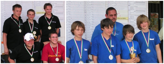 | Die Jugendlichen des 1. MGC Köln (links) und die Schüler des BGC Dormagen (rechts) gewannen die Mannschaftswettbewerbe. Den Siegern herzliche Glückwünsche und den für die DJM Ende Juli in Berlin Qualifizierten toi-toi! | ||