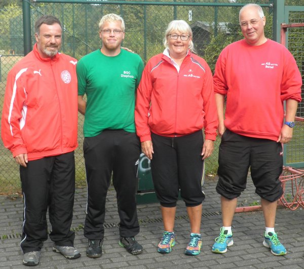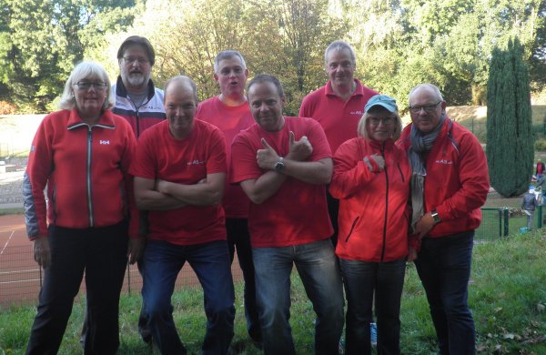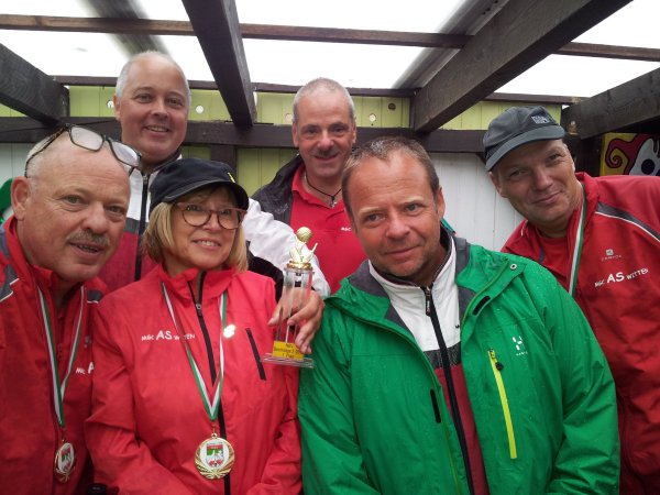 RELEGATION: Es ist geschafft ... danke an alle SpielerInnen, Helfer und Schlachtenbummler! Vorne: Margot Fritzenkötter, Ansgar Buchholz, Olaf Schmidt, Alwine und Alred Inck Hinten: Jürgen Schmitt, Peter Tabor, Volker Urban (jeweils von links nach rechts) ![]() Mit etwas gemischten Gefühlen trat unser Relegations-Team in Wanne-Eickel an - spielten doch insgesamt acht Bezirksliga-Mannschaften um sieben Plätze. Eigentlich machbar, musste man doch "nur" nicht Letzter werden. Ungemütlich war dann vor allem der Auftakt, in Wanne nieselte es am Samstagmorgen, es wurde aber mit nur einer kurzen Regenunterbrechung durchgespielt. Das bedeutete vor allem: Putzen, Putzen, Putzen! Dabei wurde unser Team tatkräftig unterstützt, insgesamt waren drei Betreuer vor Ort. Besonderer Dank gilt hier Thies Fritzenkötter, der unser Team den ganzen Samstag lang tatkräftig unterstützte. Die zweite Betreuerbinde und die damit verbundene Arbeit teilten sich Jürgen Schmitt und Peter Tabor. Danke auch an dieser Stelle an Jürgen Schmitt, Dietmar Fritzenkötter und Hellmut Greiffendorf, die mittrainierten, damit wir auch bei einem Ausfall "in letzter Minute" sicher mit sechs Spielern antreten konnten - das nennt man Einsatz. Last but not least danke an Stephan Behrens, der mit seiner Erfahrung und dem Bereitstellen von Pöttplänen, Infos, Ballmaterial und der Hilfe beim Training zum erfolgreichen Abschneiden unseres Teams beitrug. Dazu kamen dann auch noch jede Menge Schlachtenbummler, die aber an dieser Stelle nicht separat genannt werden sollen. Nach der ersten Beton-Runde lag AS Witten auf dem sechsten Platz, allerdings nur fünf Schläge hinter den zweitplatzierten Herscheidern, die diesen Platz ebenson am ersten Tag von Anfang bis Ende belegten wie die Weselaner, die einen ungefährdeten Start-Ziel-Sieg hinlegten. Unsere Mannschaft verbesserte sich auf den vierten Platz, 18 Schläge vor den Halveranern, die auf dem Nichtaufstiegsplatz "übernachteten". Am Sonntag hatten alle Spieler dann das gleiche Problem: Extrem unterschiedliche Bedingungen auf der Eternit-Anlage. War es in der ersten Runde noch leicht feucht und vor allem recht kalt, so änderte sich das ab der zweiten Runde zusehens. Die Bahnen waren trocken und es wurde so warm, dass einige der im Training gespielten Bälle und Schlagvarianten einfach nicht mehr "funktionierten". So waren die Ergebnisse auf Eternit dann auch eher mässig. Wesel behielt den Spitzenplatz ungefährdet bei, Paffendorf schob sich mit einer 128er-Eternitrunde auf den zweiten Platz vor. Herscheid und Witten belegten die Plätze drei und vier, wenn auch Castrop und Hagen bis auf drei bzw. vier Schläge an unser Team herankommen konnten. Paderborn sicherte sich den letzten Aufstiegsplatz vor den Halveranern, die damit in der Bezirksliga bleiben. Mal sehen, auf welche der Teams wir in der Landesliga treffen ... Beim parallelen Aufstiegsspiel zur Verbandsliga konnte Blau-Gold Essen nur in der ersten Beton-Runde mit den Hardenbergern mithalten, danach setzen sich diese dann klar ab. Nach der dritten Runde auf Beton (wg. des Wetters war das Turnier am Samstag auf drei Runden verkürzt worden) lag Hardenberg mit 40 Schlägen in Führung. Diese wurde dann am Sonntag kontinuierlich ausgebaut, insgesamt lag Hardenberg am Ende 89 Schläge vor Essen. Glückwunsch an alle Aufsteiger - und für die Halveraner und die Essener: Auf ein Neues in 2017! Ergebnisse (Bangolf) |