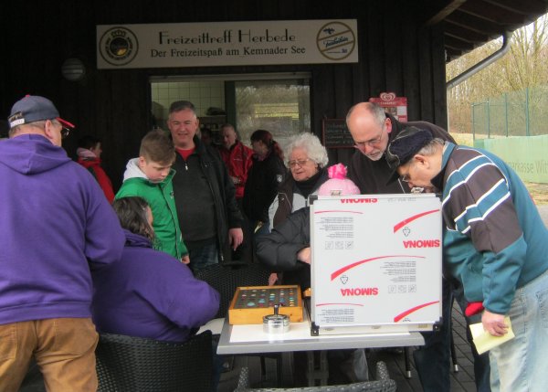 Sommer-Cup 2017 - Dritter Spieltag am 18.5.2017 Am dritten Spieltag sah die Wetterlage nicht rosig aus ... Gewitter- und Regenbänder zogen am frühen Nachmittag durch NRW. Trotzdem waren 20 Teilnehmer am Start, die dann auch mit zwar schwülwarmen, aber bis auf ein paar Regentropfen zu Beginn der Eternit-Runde gutem Wetter belohnt wurden. In der Eternit-Runde spielte Siegfried Paffrath mit 23 Schlägen die beste Runde und holte sich ebenso 25 Punkte in der Tageswertung wie Winfried Lüttenberg und Dirk Mühling, die auf Beton jeweils 31 Schläge benötigten. Für die 3 bis dahin in der Gesamtwertung bestplatzierten Teilnehmer kam jeweils die schlechteste ihrer drei Punktzahlen in die Wertung (siehe Ausschreibung): Marcus Rade 18 Punkte für seinen dritten Platz auf Beton (32), Rudolf Ginschel 10 Punkte (7. auf Eternit mit 30 Schlägen) und 5 Punkte für Volker Urban, der einen "gebrauchten" Tag erwischte und auf Eternit und in der Kombi-Wertung Platz 14 belegte. Insgesamt führen nach dem Spieltag Winfried Lüttenberg und Siegfried Paffrath mit je 60 Punkten knapp vor Dirk Mühling und Marcus Rade (58). Bei der Verlosung gewann Michael Puschner ein Essig- und Öl-Set, Jürgen Grügelsberg ein Messer-Set und Barbara Schmidt ein Limo-Glas mit Zapfhahn. |