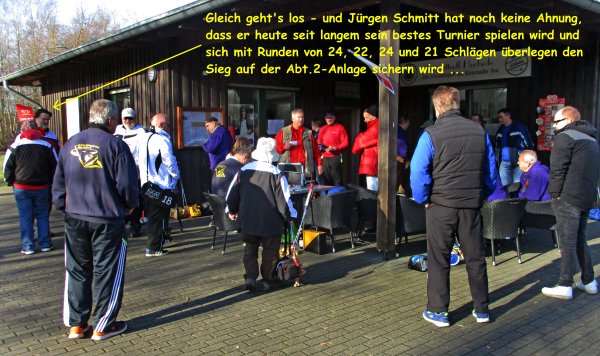 ![]() Winterpokal 2016/2017 - Bericht vom 5. Spieltag: Zum 2. Advent: Einmal Witten leicht gezuckert ... Der erste "richtige" Winterpokalspieltag bot den 27 Startern 6 Grad unter Null, teilweise etwas vereiste Bahnen, viel Sonne und etwas Reif auf Wiese und Büschen. Mit den ungewohnten Bedingungen kam Alfred Inck am besten zurecht, in der ersten Runde spielte er 29 "korrekt", in der zweiten liefen dann auch bei ihm "nur" noch 5 Asse. Da er aber nur einen Fehler machte, reichten die insgesamt 61 Schläge heute zum Tagessieg vor Philipp Lange (62) sowie Norbert Eilert und Marcus Rade, die jeweils 64 Schläge für die Doppelrunde benötigten. Auch in der As-Wertung holte Alfred (zusammen mit Dieter Lange) mit insgesamt 23 Assen den Tagessieg vor Norbert Eilert, der wegen der ungeraden Starterzahl "mit sich selbst" zusammen spielte (22 Asse) und Alwine Inck/Philipp Lange, denen 18 Asse gelangen. In der Gesamtwertung führt weiter Karl-Heinz Wolf vor Marcus Rade und Philipp Lange, Philipp und Karl-Heinz führen auch die As-Wertung an (65 Punkte), dicht gefolgt von Dieter Lange (64) und Marcus Rade (56). |