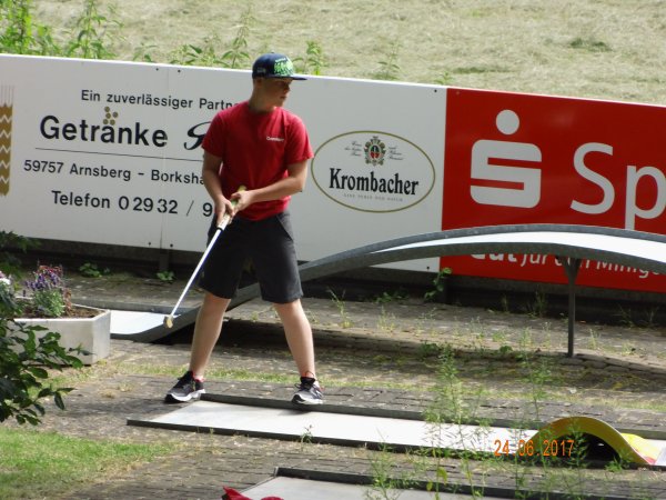 Sommer-Cup 2017 - Fünfzehnter Spieltag am 10.8.2017 Bei ganz leichtem Nieselregen starteten fünfzehn Teilnehmer auf der Beton-Anlage mit einem Kanonenstart. Leider konnten nicht die geplanten zwei Runden gespielt werden, das Turnier wurde auf eine Runde verkürzt. Am besten kam Dominic Urban mit den Bedingungen klar, ihm gelangen acht Asse, was trotz zweier Fehler zum Tagessieg mit 30 Schlägen ausreichte. Auf den Plätzen 2 und 3 folgten Marcus Rade (31) sowie Rainer Henseler und Michael Puschner (beide 32). Marcus Rade übernahm mit 206 Punkten wieder die Führung in der Gesamtwertung vor Winfried Lüttenberg (199) und Volker Urban (189). Bei der Verlosung gewannen Nicole Lieber und Rudolf Ginschel je einen Ball und Michael Puschner ein Eis. |