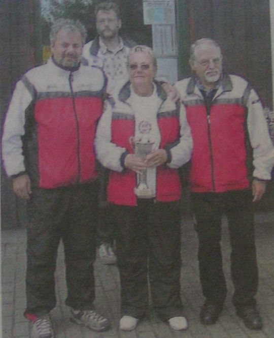 in Herbede ausgetragen. Von Gastgeber MGC "AS" Witten gingen vier Starter und eine Mannschaft ins Rennen. Durch einen Heimvorteil rechneten sich die Wittener doch etwas aus, wobei das gesamte Starterfeld (55 Spieler und neun Teams) teilweise hochgradig mit Spielern aus dem Bundeskader besetzt war. Der erste Spieltag gestaltete sich durch permanenten Nieselregen als sehr schwierig, einzelne Schläge wurden unberechenbar. Zur Halbzeit nach vier Runden sah es für die Wittener aber nicht so schlecht aus. Das Team hielt Platz drei (364 Schläge) hinter Velbert-Neviges (361) und den favorisierten Mönchengladbachern (346). Bei den Senioren belegte Winfried Lüttenberg (119 Schläge) Rang sieben. Bei den Seniorinnen belegten Marlis Ruge (128) und Christel Endberg (129) die Plätze drei und vier. Bei den Senioren II war Rolf Lenk (117) Zweiter. Da am nächsten Tag wesentlich bessere Wetterbedingungen herrschten, wurden die Platzierungen kräftig durchgemischt. Mit weiteren vier gleichmäßigen Mannschaftsrunden (346, gesamt 710) schob sich der MGS auf Rang zwei hinter Mönchengladbach (696) vor. Winfried Lüttenberg konnte seine zwischenzeitliche Führung nicht ins Ziel retten und wurde letztlich mit 225 Schlägen Zweiter. Der Sieg ging an Norbert Eilert (Bergisch Land; 222 Schläge). Marlis Ruge verteidigte mit insgesamt 244 Schlägen den dritten Platz. Christel Endberg verpatzte leider zwei Runden und wurde mit 268 Schlägen Siebte. Rolf Lenk konnte seine Position ebenso wahren und blieb mit 241 Schlägen Zweiter. Hier gewann mit deutlichem Abstand Franz-Josef Reinartz aus Mönchengladbach mit 233 Schlägen. Mit drei von fünf möglichen Pokalen war damit die Ausbeute für Gastgeber MGC "AS" Witten überaus erfolgreich. ![]() Die Drei mit den Pokalen: Das MGC-Trio (von li.) Winfried Lüttenberg, Marlis Ruge und Rolf Lenk. Foto: ASW | |